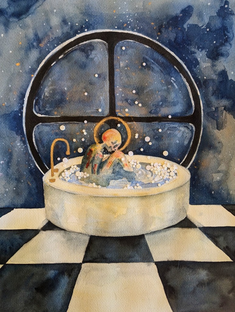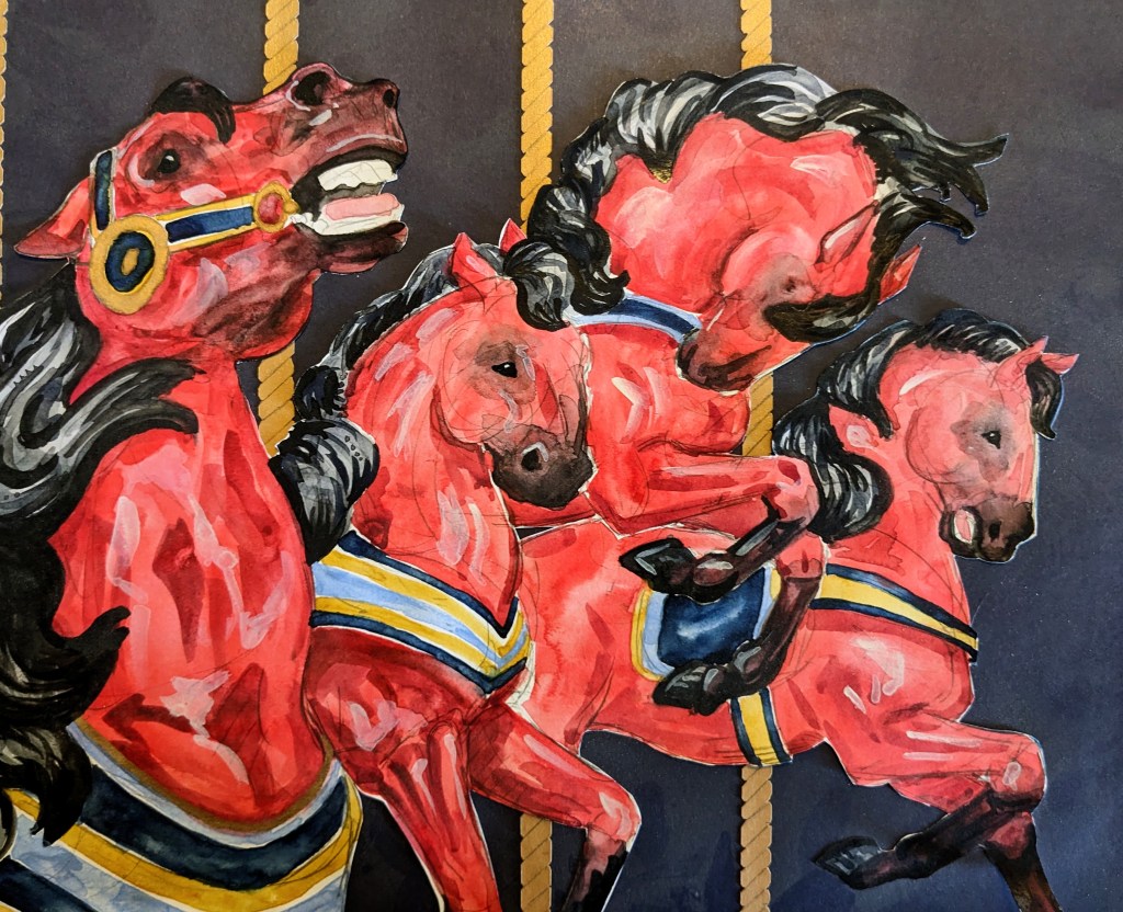Gallery Work from 2021 to Current Work Before 2021 Carousel Grave: Cut paper, graphite, and coffee stain. (2ft by 4ft) Jumbled Carousel: Acrylic on Canvas (32” by 38”) Lady of the House: Acrylic/cut paper. (2 feet by 4 feet) Portrait Study: Oil on Paper (11” by 14”) Here Comes the Nighttime: Inkwash and Torn Paper (30” by 40”) Whole Devotion: Acrylic on Canvas (2ft by 3ft) The Good Part: Paper, collage, acrylic paint. (22” by 36”) Paper Horse: Watercolor and Cut Paper (10” by 8”) Muscled Horse Shoulder: Oil on Canvas Paper (11” by 8.5”) Saint Circle: Cut Paper and Watercolor (20” by 14”) Will You Go to Prom with Me?: Cut paper and watercolor (11” by 14”) Standing Skelly: Cut Paper and Watercolor (5” by 7”) Flesh to Stone: Watercolor and cut paper (11″ by 14”) Intimate: Cut paper and watercolor (11″ by 14”) Out in the Woods: Cut paper and watercolor (8” by 10”) At the Beach: Cut paper and colored pencil (11” by 14”) Here There Be Monsters: Watercolor (11” by 14”) PIzza Forever: Cut paper and watercolor (11” by 14”) In Her Room: Graphite (7” by 10”) Has God Really Said?: Watercolor and ink (14” by 11”) And a Little Child shall Lead Them: Watercolor and ink (14” by 11”) That’s a Good Coffee: Screen Print Greeting Card (5” by 7”) Fall Window:Screen Print Greeting Card (5” by 7”) Fall Serene: Screen Print Greeting Card (5” by 7”) In My Room: Cut paper and watercolor (11” by 14”) Yellow Socks: Screen Print Greeting Card (5” by 7”) Winter Window World: Screen Print Greeting Card (5” by 7”) Share this: Click to share on X (Opens in new window) X Click to share on Facebook (Opens in new window) Facebook Like Loading...